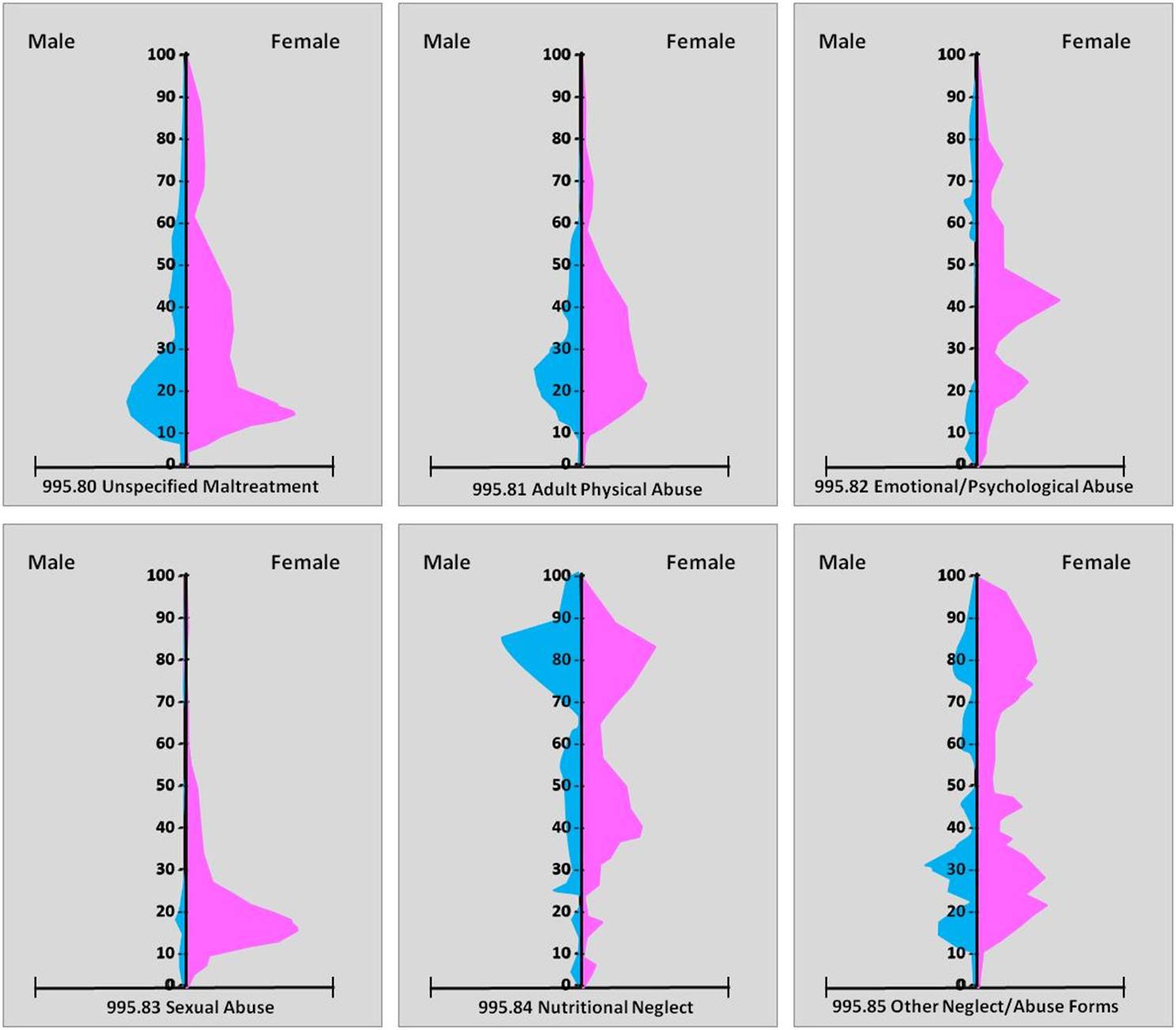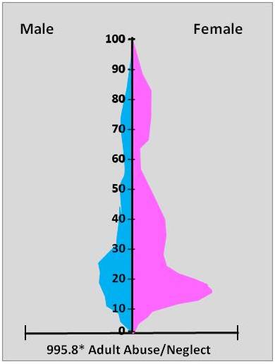Adult abuse is more varied and diverse in its behaviors, actions, and resulting ICDs documented clinically with regard to age and gender. The reasons for these differences are very complex, and involve socioeconomic differences on behalf of the victim, gender inequality human behavior differences targeted towards the victim, gender-specific behavioral differences displayed on behalf of the perpetrator, and age-specific differences displayed on behalf of the perpetrator. This makes for a very intersting series of research questions realted to these findings. They include: