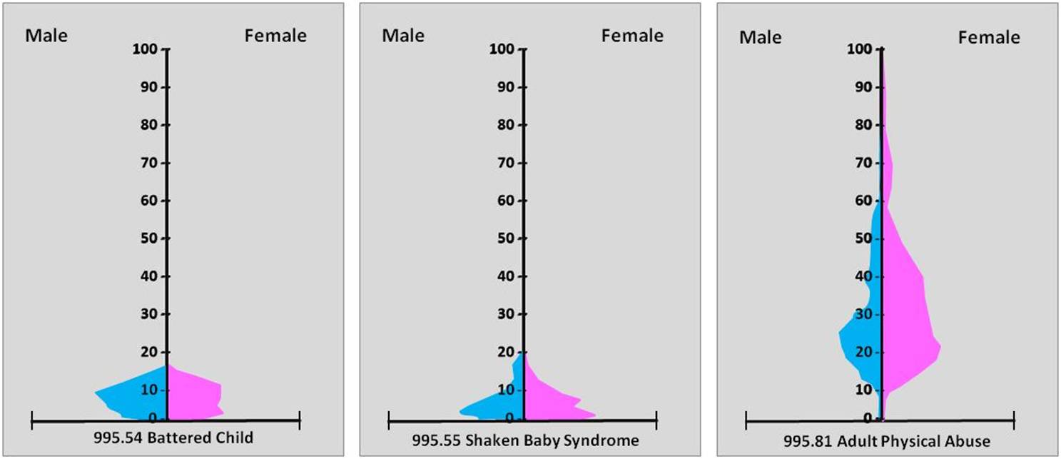 Before reviewing the following tables, it helps to recall for a moment our own experiences with news coverage, our readings of the popular culture of medicine and public health, and any medical research we engaged in related to abuse–adult or child. This retrospection is used to define our impressions on child and adult abuse. Some of these impressions are accurate, others more subjectively defined. The population pyramid statistics of abuse and neglect provide us with support of many of our impressions out there, but also open the doors to new research questions.