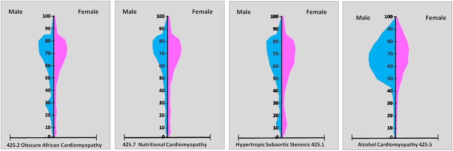The above flowchart for cardiomyopathies can be integrated with the Health Belief Model. For African cardiomyopathy(425.2) , the age-gender distribution most closely resembles nutritional deficiency cardiomyopathy (425.7). Given the age-gender distribution of Takatsubo versus cardiomyopathy, it appears tak0tsubo is primarily a psychosomatic condition induced primarily through personal perceptions, beliefs and knowledge, more so than a result of a biological phenomenon related mostly to some histological or cellular defect in cardiac tissue. There is no other way to explain why women within their older years manifest this condition so much more than men.
