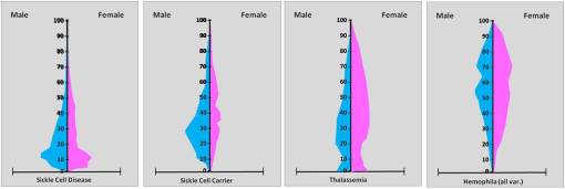 We can constrast the Sickle Cell curves with those of Thalassemia and Hemophilia (all are above). There is an inveitably high mortality rate by the age of 65 years for people with Sickle Cell, be it in its active state or partially presenting itself within the bodies of carriers. The latter have a slightly longer longevity rate, and demonstrate male prevalence peaks earlier than female peaks, with females living longer and in greater numbers during their entire reproductive years period. The numerous reasons for socile cell mortality pertain to the effects of sickling cells on the microvasculature of solid organs, the splenomegaly these effects can result in at the organ systems level, and a variety of long term well localized anoxic states.