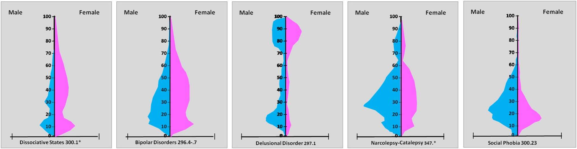 Dissociative States, Bipolar Disorders, Delusional Behavior, Narcolepsy/Catalepsy, and Social Phobia are several ICDs related to Sociocultural Syndromes in recent decades.
