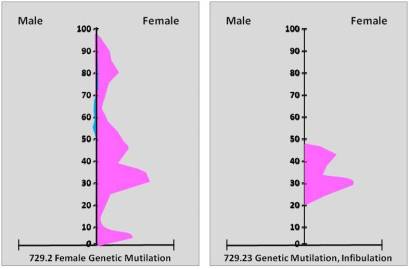 The surgical processes typical of certain African societies includes a clitorectomy, labial removal and closure process (infibulation). Different ICDs are provided based on the degree to which this surgical procedures completes all three of these tasks. Although infibulation and its precursors are extremely rare events, rarely noted in the medical records along with use of the appropriate ICDs, these processes are found in exceptionally large population studies (>50M). They therefore provide us with some insight into the very poorly studied age-specific sociocultural behavior problem.