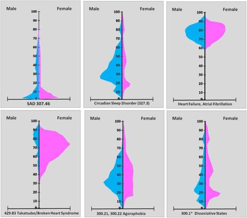 In the above images, the culturally-linked disease that is the focus of this query is on the left. Which of the other 3 best matches it’s form and distribution by both age and gender? There is a formula that can be used to quantify this overlap, but the picture makes it fairly clear which one it is in this case. Takotsubo ~ Factitious Disorder, in that both afflict older populations and are attached to some sort of emotional trigger that impacts women more than men in their older years. The anatomical-physiological theory often posed in the literature has a distribution that is the most equally distributed for the above, in terms of men versus women.