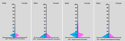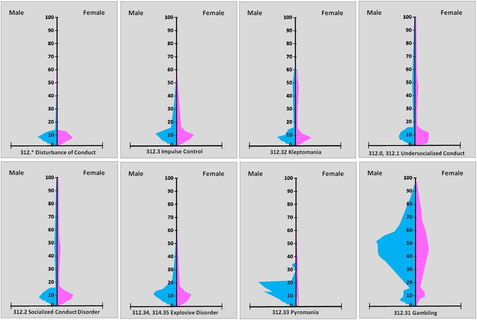 ICD series 312.*-Conduct Disturbances, 313.*-Diseases Specifc to Childhood or Adolescence, 314.*-Hyperkinetic Syndromes and 315.*-Specific Delays in Development all demonstrate age-gender prevalences focused on the <20 year old range. For the 312 series, only 312.0 and 312.1 demonstrate significant activities involving the very young children < 10 years of age. Impulse Control (312.3), Explosive Disorder (312.34, 312.35), Kleptomania (312.32), and Socialized Conduct Disorder (312.2) in particular show distributions of considerable prevalance in both genders for this age group. Pyromania (312.33) is particularly interesting in that there is an increase in prevalence right up until 20 0r 21 years of age, involving almost completely the male gender. Only one of these 312.* series demonstrate exceptionally high male related rates, extending throughout the total life years–Gambling (312.31). Male claims have ICDs with this entered as early as a few years of age, peaking in the 30s and 40s, with female patients demonstrating a prevalence peak of 45 years of age, but a numbers peak at 55-58 years of age.