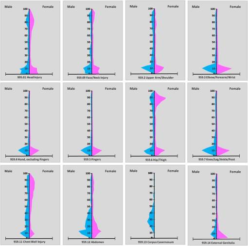 The continuation of this problem well into adulthood suggests a condition that is not age-specific and biological. Instead, it is probably psychosocial in nature, with age acting as a determinant due to higher frequencies for specific age ranges. Notice the significant difference in gender distributions for the second example. Since biological is ruled out, this represents a gender related indirect lifestyle and environmental influence as being a possible cause, of an age-specific socially predictable human behavioral cause. For both examples above, female related events significantly outnumber male-related events.