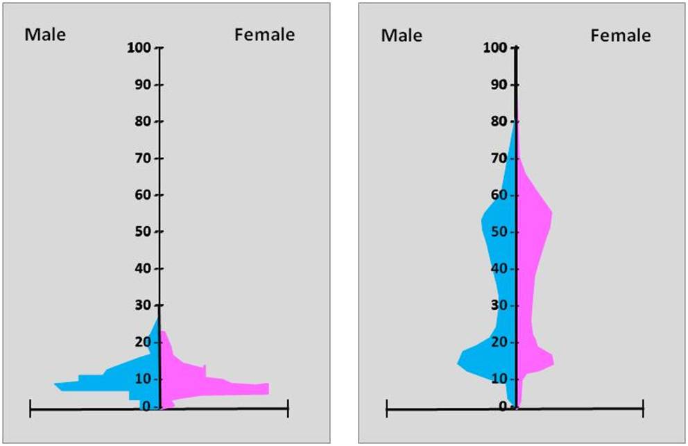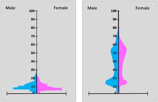 These next examples (charts above) detail a behavioral-cultural syndrome and a biological-preventible infectious disease condition. Both have gender-specific targeting taking place. That with the socially defined behavioral-cultural causality is gender targeted due to social reasons, which require a unique form of intervention process. The infectious disease gender-differences for the other conditions may be culturally based or human behavior and attitude/culturally based. In other words, certain aspects of the gender defined lifestyle relate back to likelihood of infection and spread versus the other which shows a likelihood of having culturally defined gender specific actions impacting the distribution pattern. There is no difference in age-gender relations for a non-sociocultural event, for its causes are completely environmental and naturally based. Unless the environment and nature are impacted by gender, age distributions are identical for conditions without the prejudice of age playing a role in the condition. (The one of the left is sociocultural, that on the right is due solely to natural features and human physical state.)