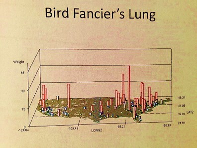 - A number of Pacific Rim zoonotic-anthroponotic diseases were identified. Also geographically distributed are people experiencing Mushroom growers’ lung at specific points in the Midwest and Northwest, a longitudinal band of people with coal miner’s lung, a tropical-temperate zone cluster of people with maple barking lung disease (not in maple tree country), a southern California-LA peak in bagassosis, and some very regionally distributed and even locally clustered examples of fungal dermatitis diseases like rhinosporidiosis and coccidiomycosis.
