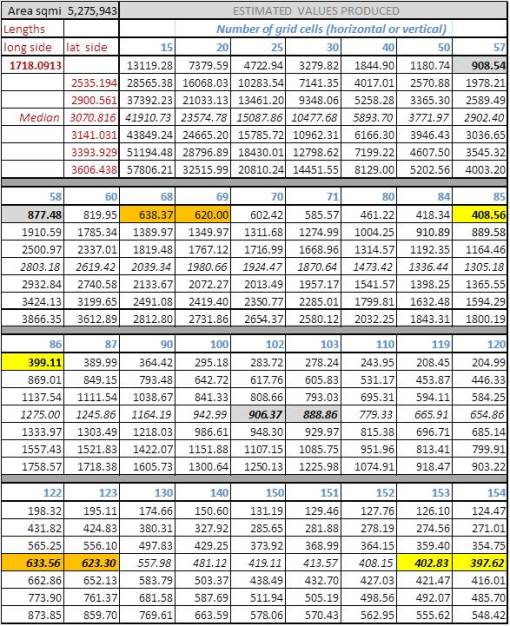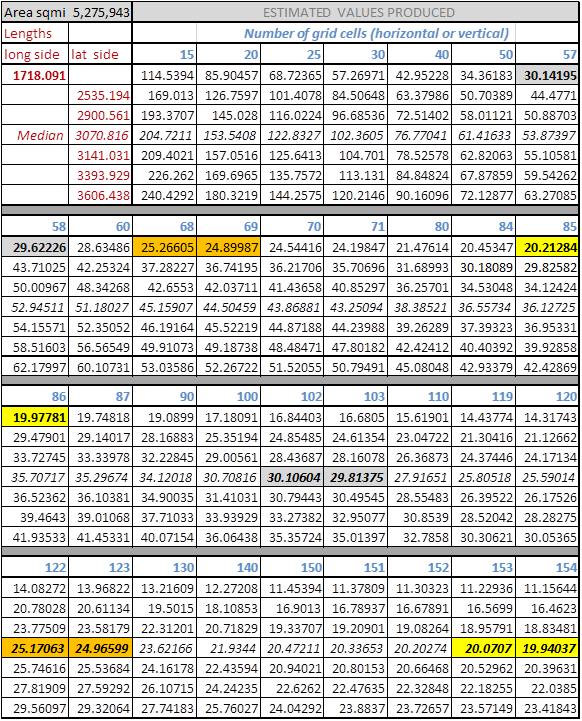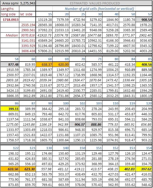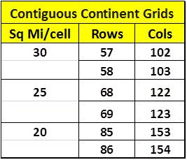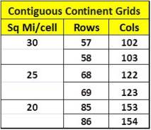 The above point is made due to the nature of mapping using a lat-long decimal degrees method. Errors increase in different ways along the various latitudes. Where ever area units are involved in the analysis instead of length units, these differences are squared. In terms of selecting the row and column numbers, for the 20, 25 and 30 square mile cell sizes, two values are given (related areas for which are displayed as highlighted pairs in the table below)–one underestimates the grid cell area based upon edge sizes and the second slightly overestimates this area.
