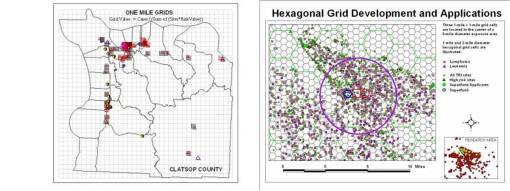 Examples of grid maps developed for the Oregon Toxic Release study: the traditional square grids approach and my hexagonal grids approach.