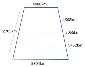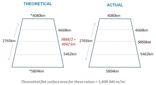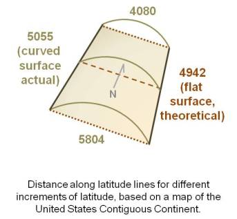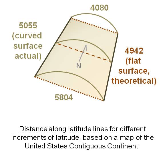 Since the rhombus is a flat polygon and earth’s surface is not flat, there is some error built into the use of a traditional rhombus equation for calculating mileage across one direction in degree units due to the curving of the earth’s surface. This curvature effect is exaggerated in the following figure. The true rhombus equation would suggest that base size along the the half way point across a flat surface would be 4942, if the two end values 4080 and 5804 were for flat surfaces. On a true map however we find the true value along this line is 5055, 97 metric units or approximately 2% more than the predicted value.