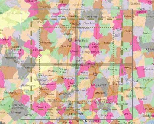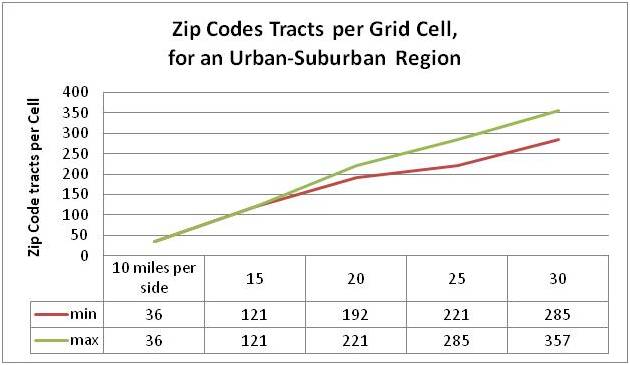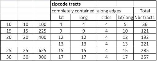 More notes: Pulling all of the above together, this method of research is for an exceptionally large area, involving zip codes and square grid cells that need to be developed by merging the data presented. Obviously, the size of the grid cell is best when it is typically greater than the size of the zip code tracts. In the above image for New York Zip codes, the 5 mi x 5 mi area barely covers an entire zip code tract area due to the irregularity of these polygons. A 10 mi x 10 mi area tends to cover a 4 zip code x 4 zip code tract array, with a 5 tracts x 4 sides or 20 demonstrating partial coverage along the edge; the total for this calculation is 16 + 20 or 36.