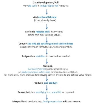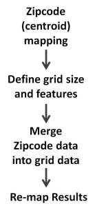 The purpose of developing the zip code data is to then merge these results more in the form of a square grid analysis of zip code based data. The data types evaluated using this process are numerous, and tend to focus on ICDs, but some examples involve other metrics employed for health analysis, based on patient behaviors, patient responses to surveys, or automatic computer generated health risk scores assessment programs.