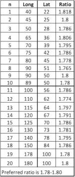 To produce grids with cells with area values fairly close to commonly used whole number values, the following row-col relationships were defined for the use of this methodology.