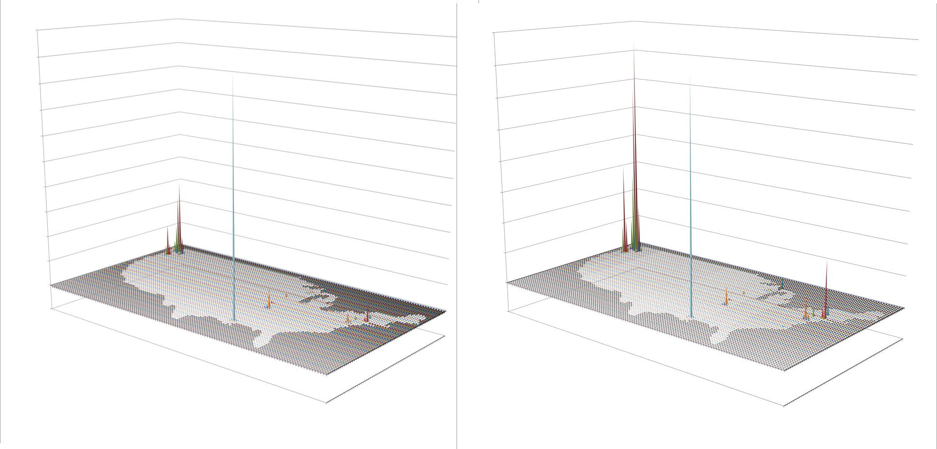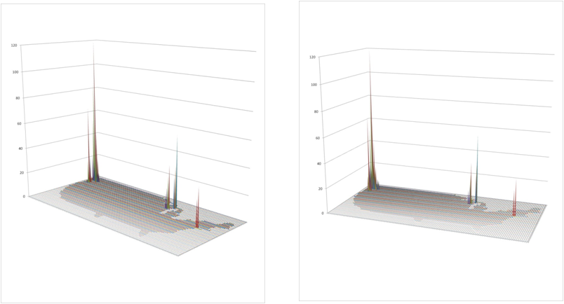 These images represent the process in producing the maps and 3D map videos. These all represent the same data. Images 1 and 6 are identical except the z axis has been adjusted. Images 3 and 4 represent the data, at different tilt angles, without basemap cells identified and mapped. This same image is modified with the basemap data added for image 2. Image 5 is much like a contour of the map, with kernel density taken into account and so represents a true concentration of the cases, useful in defining disease niduses. In theory, a kernel density map for numbers of cases overlain on a grid x kernel density map for adjusted values or IP (not shown above) = final map depicting areas with highest density, highest numbers, thereby producing an intervention map, where interventions can take place in a specific region due to high prevalence rate, or high numbers of patients, or both. [This latter formula is in fact a result of my work on risk zones prediction along flood plains, developed as part of the standard IDRISI Remote Sensing teachings back in 1997.]