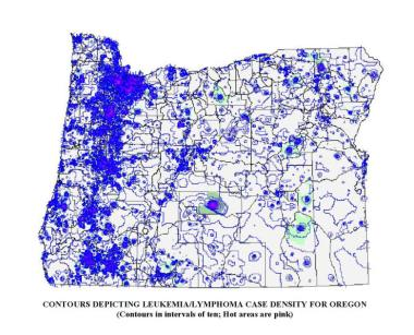 The above contour map was run on several thousand cancer cases in the state of Oregon in Winter of 2003/4, between jobs. I used ArcView 3.2, Spatial Analyst, with an Arc Avenue Extension added for grid mapping. The state was first converted to a square grid, with cells provided unique identifiers and measuring approximately 1 mi x 1 mi (I believe the state grid was 300 rows x 407 cols-Link to this). Centroids were then assigned to each cell, and any grid cell values, including lat-longs, were transferred to this shapefile; this process took 5-6 hours. Counts were the made of cancer cases (point data) per grid cell and that value also assigned to the cell centroid (range 0-30). Contours were then produced based on the spatial distribution of these centroid values. The contours were in increments of 1, with isolines mapped using a two-color range, by units of 1, with low to average areas in blue and hot spots (>5) indicated with increasingly hot to dark pink lines. The pink areas represent core urban areas, where the greatest numbers of cases were found due to the reporting methods for the time. Look closely at the state edge along the Columbia River at the south edge of the state–the contour lines extended to the edge of the map (not the edge of the state) and so had to be covered up with a white polygon with a boundary mimicking the page and state borders. Since the technology during this time was limited, the contour map alone took over 6 hours to run; this whole process took about two 10hr days. The computer I used was a Windows97 Compaq Presario laptop with a 4gb HD (it could not handle an 8); the laptop had to be laid upside down on my desk, with a 4″x4″ old IBM computer fan aimed at its lower corner due to a battery-related overheating problem with the system. Due to the risk this posed to the hardware, I never ran this program again to produce such a finely detailed map. Which was just as well, Upon closer inspection I noticed the erratic 90 degree turning of lines produced in the contours when viewed up close, a few square miles at a time. Soon after, I developed and then switched to my small area hex grid mapping technique in order to produce smoother, more appealing, and more accurate contour lines.