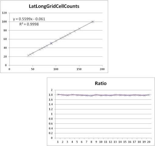 Because this is a lat-long map and not an equal area/equal distant mapping problem, some additions steps were needed in order to correct for the changing size of the edges of the rhomboids that defined the lat-long sections across the US map. At the northern boundary of the US, the distance between westernmost and easternmost corners is significantly different than the same distance between the southeastern and southwestern corners. The ratio for this degrees longitude versus degrees latitude relationship show that a 1.78:1 to 1.80:1 relationship exists for the mapping parameters. In terms of integer values, this suggests that an x-by-y grid with x~y should be close to one of the following sets of numbers: