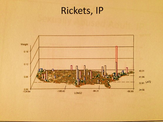 The algorithms used to generate these maps were all developed using ICD9s, HICLs, and V- and E-codes, with separate algorithms used to convert the data into a mappable grid maps dataset, followed by one or more of my rotating map/map video algorithms (see links at end of my Surveillance Applications … page). ‘IP’ refers to an independent prevalence calculated for cells, without adjustments made using nearest neighbor statistics.