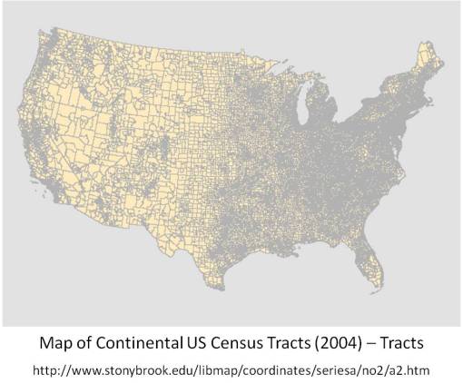This classic example of this ‘zero problem’ occurs with block-related census data. The classic census study makes use of census tract to perform a study. In general census tracts are very big. The bigger the tract, the less relavent those larger tracts are to the research at hand. In the image depicting tracts below, we see abnormally large tracts in the mid to eastern hinterlands of northern California and Oregon. In some cases, people exist in these tract areas, but so few that these polygons are useless when it comes to studying density related information such as diseases and accidents per square mile.