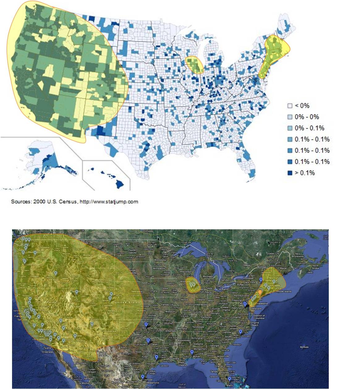 The mapping of this syndrome also tells us something very unique about Takotsubo. It does demonstrate possible clustering about Japanese-rich multiethnic regions in the U.S., these regions were identified based on a review of Japanese American culture in general (wikipedia) and a review of Japanese food distribution grocery stores in those areas poorly defined by the wikipedia source.