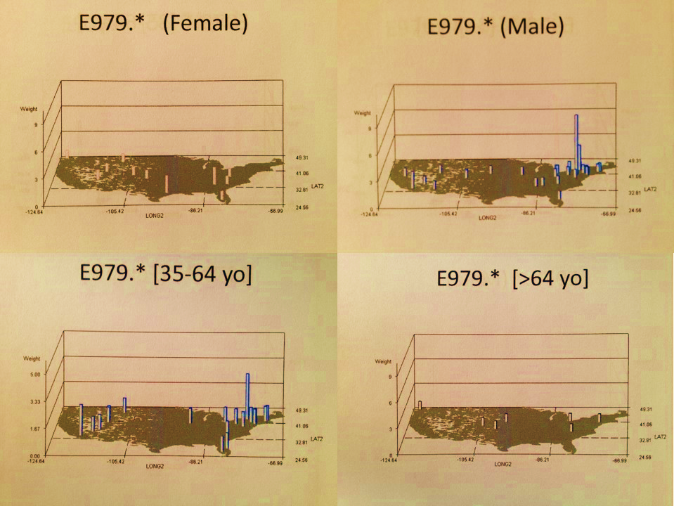 Nevertheless, we can still use EMR data to monitor and document population health in terms of criminal activities, the development of an effective forensics exploratory database, and the implementation of a profiling technique for evaluating behavior types at the personal, social and regional level. For example, the following spatial review I carried out for three conditions possibly related to terrorist attitudes, mass killing episodes and the like, failed to demonstrate a “predictable pattern” but still demonstrated “hot spots” in need of review or recall at some later point, should a new terror or mass murder event arise. In the least, researching why these small 25 mi areas form peaks would be of some benefit to such activities.