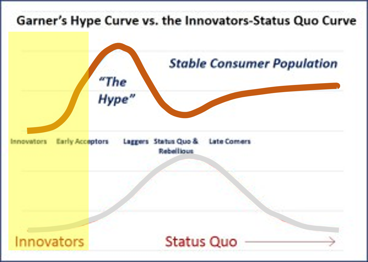 The above happens because these companies are unable to differentiate when they are behaving in accordance with the Garner’s Hype curve for success, rather than following the true Innovators-Status Quo [ISQ] curve that most corporations follow. The ISQ Curve exists for a reason. It is normal human behavior to try to think of ourselves as ahead, without spending the time needed to see where everyone else lies in relation to us. Chances are, we are in the heart of the ISQ Curve. Hopefully we are not so naive that we are far behind of the eight ball–so far into our past that we jeopardize our future in the field. There is also this 15-16% likelihood or one in three that we are on the good side of progress, meaning we are ahead in our business or field, enough to even slow down for a while and become “peak average” if we wanted to.