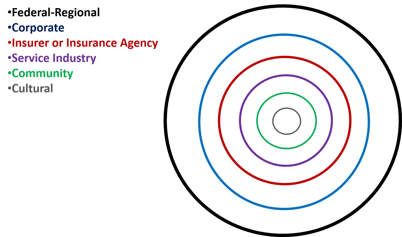 Corporate::Culturally-bound: this constitutes coverage either at the large employer level or multiple insurance agency reviewer level. The population health metrics are more business analyses related than population health related, and so cultural sensitivity is perhaps not jeopardized, but the requirements for a sufficient knowledge base regarding culturally-bound diseases could be lacking. For example, it would not be a surprise to find large businesses with employees of one cultural type, not so savvy in a similar but not identical culturally based lifestyle, being used to evaluate disease and well-being for members of that other cultural system. Like the prior level of service, there are limited interactions these larger industries can take to intervene in the management of very poor results. These companies try to manage large regions and oversee the work by numerous companies and programs serving similar needs. They have the power to manage health data for very large groups, but often opt out of engaging in such processes, unless they are required to do so due to the nature of their business. (Insurance companies are monitored, and their third party overseers as well, but the larger monitoring agencies or companies for each may not be fully monitored other than financially.)