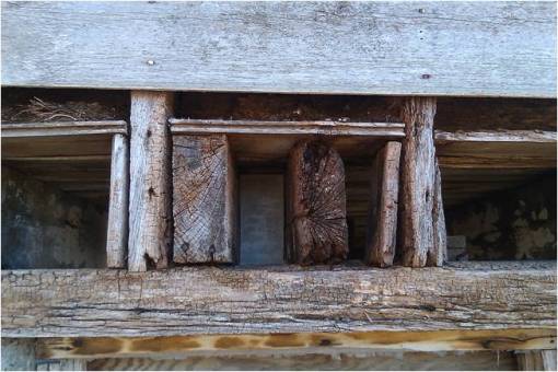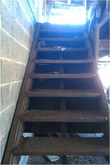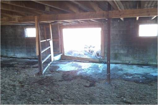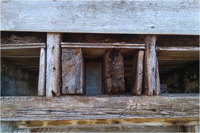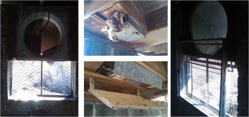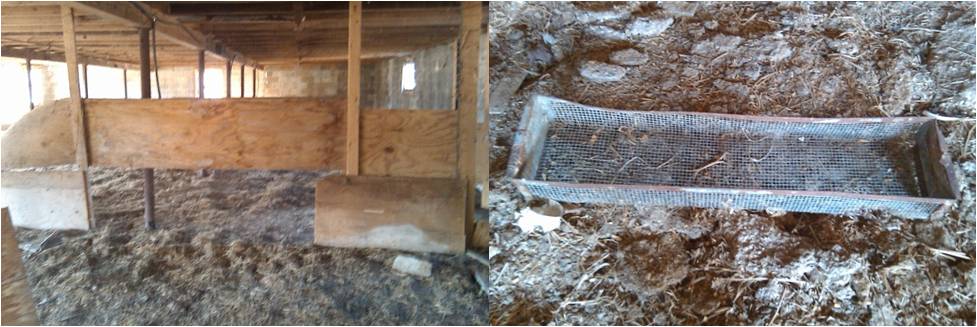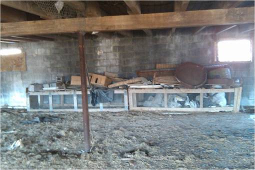 At the far western end of this first floor there was a special room with part of its door controlled by a long piece of plywood placed at ground level, as if to allow animals in and out of this end space. Chicken wire separated this room, about one-fourth of the floor space, from the rest of the area.