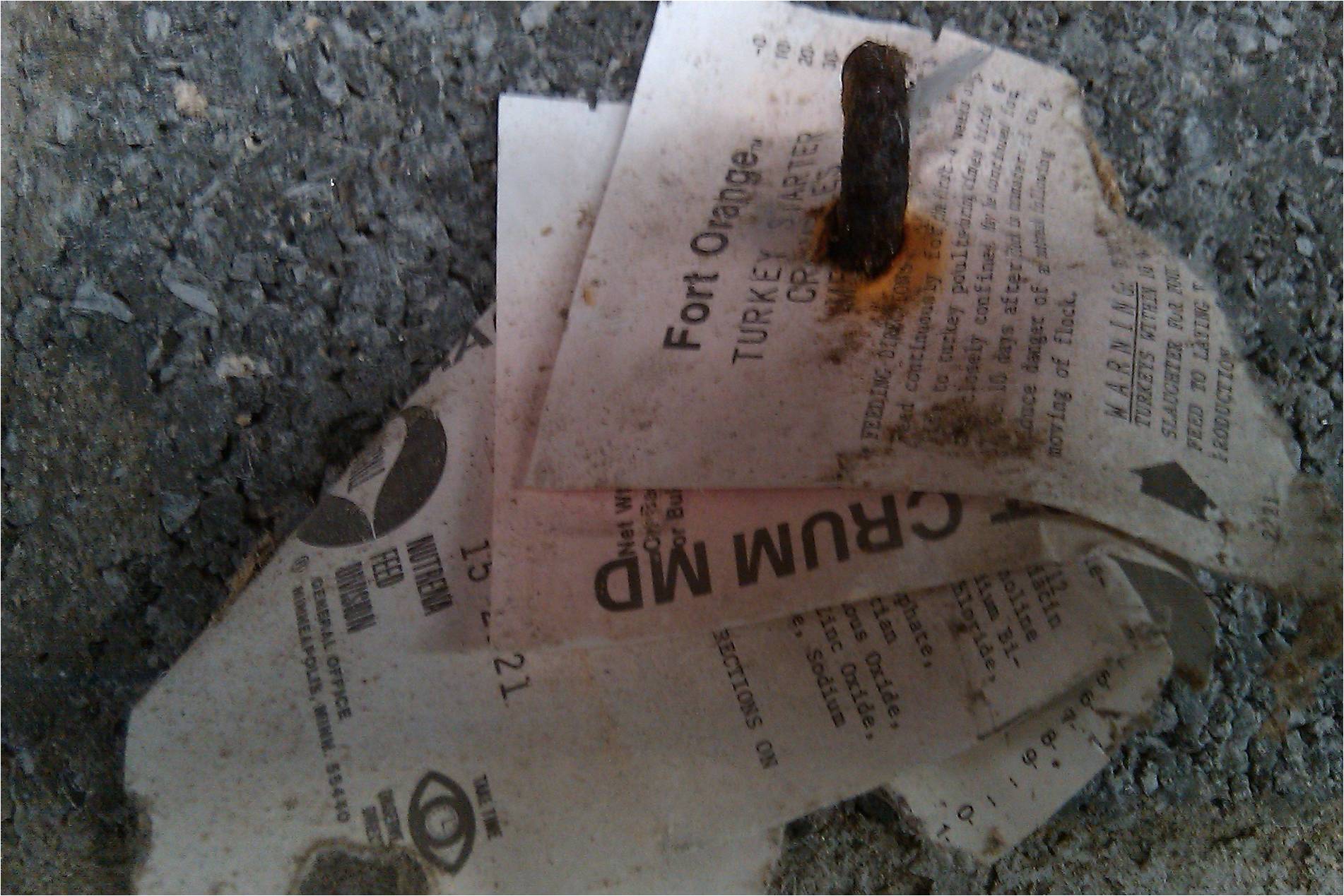 All of these tickets hanging on the wall stated “FT ORANGE TURKEY START CRUM MD.” At first I thought the last two words indicated an MD by the name of Crum was somehow involved with what took place here, perhaps as a veterinarian specializing in poultry or a local public health inspector (To the South about 5 to 10 miles is something called Crum Elbow Creek; I though Crum might have been a family name). Reading these slips, everything about this facility was spelled out. These were the slips detailing the use of what was called “TURKEY STARTER CRUMBLES MEDICATED.” The medication was Sulfaquinoxalamine, which according to the slip was used as an “Aid in preventing outbreaks of coccidiosis due to Eimeria melengrimitis and E. adenoides.” [For the specifics on this groups of turkey diseases see http://www.clemson.edu/public/lph/ahp/disease_links/images/coccidia.pdf.]