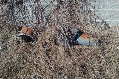 Also behind this long concrete building there were the remains of another building or two, now well concealed by the vines overgrowing it. There was once a back room here, a one floor facility with a lot of plumbing. It was possibly a slaughter or packaging house due to its proximity to the rear doors of the large barn and positioning right alongside a large dirt and gravel clearing. The main driveway for this place led into the property and directly to this site. The piles of large wood, iron and even some electrical pieces suggested this room of unknown use had since not only collapsed, but also been covered by several tons of other scraps and building remains. The following are views of the back face of this large gray brick building. Beneath the vines there was layer upon layer of assorted metal debris, shelving units, 20 foot long feeding trays, braces for the framing of the roof and wall, etc. Right at the back edge of this place, next to the straw and hay field, there was an old latrine house, apparently used in recent decades mostly by deer hunters.