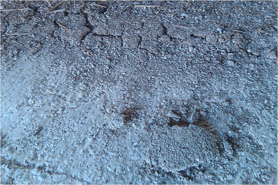 Once I got close to the middle of this second floor, I noticed that the surface of this floor was interesting (to put it nicely). At first it seemed as though a top surface of cement was used to seal the main floor. But it was peeling off in bits and pieces or a layer about one-eighth of an inch thick, and varied in make up from mostly hay to mostly white powder.