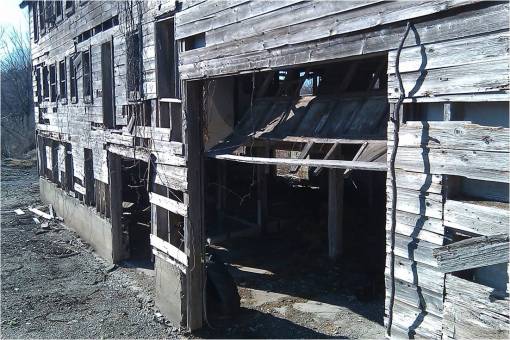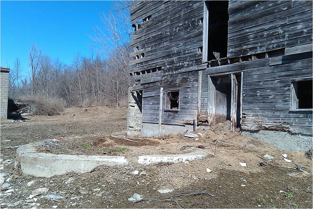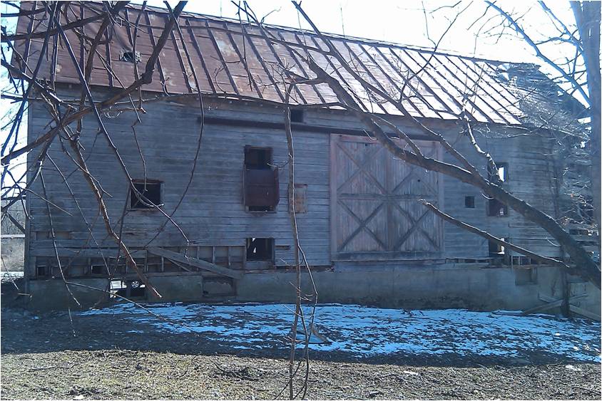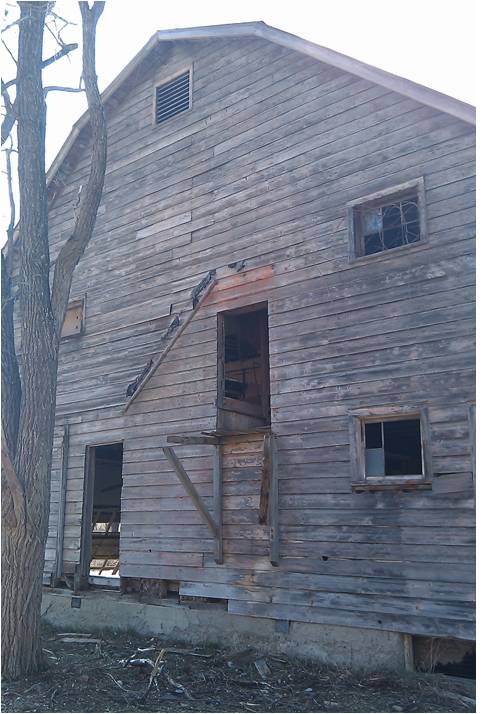 A look at the back face of this barn I was viewing provides us with a little more insight into its multiple uses. There are three sets of openings provided for specific uses. Wooden crates and bales of hay could be removed by either side, with the remains of a slide still seen of the left (east) side. There were no stairs or remains of stairs that could be found to the second where these bales were kept. The third loft set above the second was possibly used for storage, but consisted only of cross beams, placed several feet apart, and lacked any signs of bearing a solid floor.