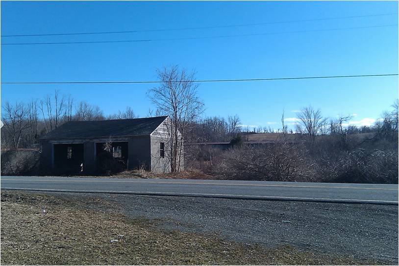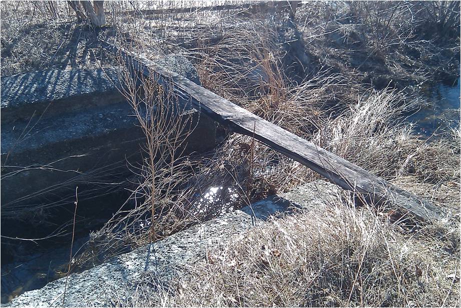 With my interest now high, I decided to walk over to that building as well to check it out. Behind the true garage on the edge of the road there was a stream passing from left to right through a concrete channel, and a 3 to 4 inch thick, 10 inch wide board lying across it that I used to cross to the other side.