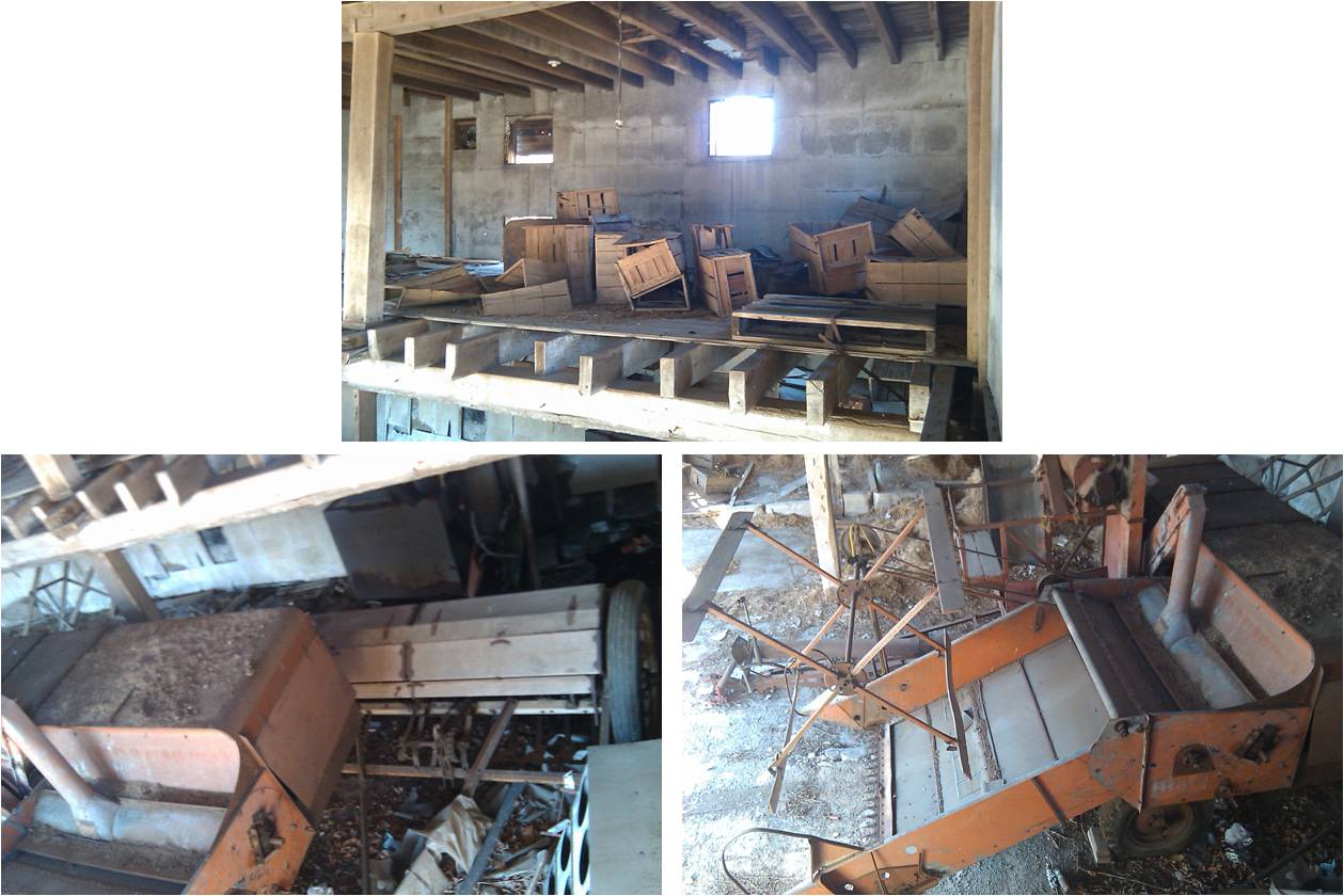 The second floor storage space also held wooden crates, which were empty. Upon first observations, these looked like old and flimsy, and rather thin, crates used to store certain kinds of produce for shipping. An impression that stayed with me for the next few minutes. Looking downward from the east side of this building, by way of one of its side windows at ground level, I could see what is called a combine harvester. The design of this harvester, in particular the shape of its front rotating cylinder and the number of arms (4), was the first solid clue I had for which time period could be assigned to this barn’s history–the 1960s.