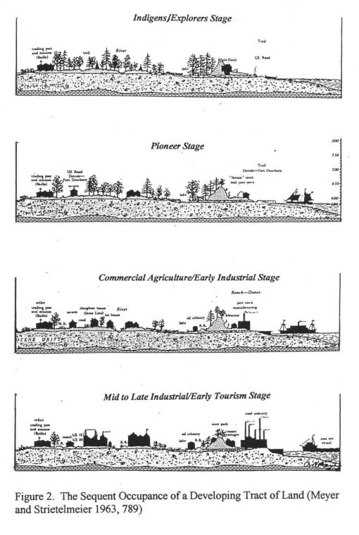 The James Way adds a twist to the human sequent occupance model promoted by economic geographers during the 1960s. The traditional model of a place is that it changes from farming to industrial occupations. The original models produced by its promoters in the 1960s never really considered farming and agriculture as major industries. This was changing during the 1960s into 1970s, and is perhaps even why the Meyer and Strietelmeier model had so much difficulty being supported for this way of interpreting the changes in land use over time. This James Way setting provides us with an example of how the Commercial Farming/Early Industrial setting in the above sequent occupance model came to be. Exceptionally large scale farms became the standard for some of the more developed farming regions during the 1960s and 1970s.