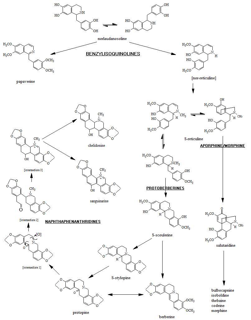 When we apply this rule to the formation of a broad class of alkaloids like the benzylisoquinolines (BIQs) we find there to be very good examples of this modification of chemical form to more complex structures. For the BIQs, we see ring structures that progress from 2+1 (benzylisoquinoline) to 4 (protoberberine) to 5+ (naphthphenanthrene) cyclicity. The increases in double bond aromatization in part lead to a “darkening” of the resulting color of these alkaloids on the rainbow (red colors are longest molecules with most rings and most alternating double bonds; yellow have less of these–the half-sized alkaloid break down product hydrastinine, a product of the yellow alkaloid hydrastine in goldenseal, is sky blue under SW UV).