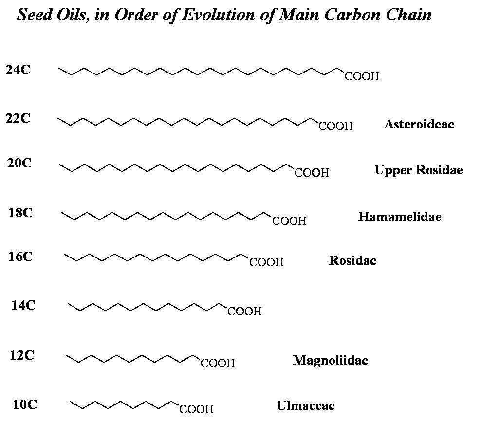 Fixed Oils. The chemistry of fixed oils is an excellent example of increased molecular size with evolution. Notice the progression of fixed oils from short chain (C12-C14) to very long chain (C22-C24). The names of subclasses, orders and families are provided to demonstrate an evolutionary process here. Fixed or seed oils are some of the best examples of this evolutionary process. The early evolving Magnoliidae of the tropics have short chain fatty acids, more than adequate in tropic settings. They are quick to produce and do not require too much merging of 3C to 2C generated precursors needed to generate the oil chain. The seed oils of the tropics are predominantly short chains (<16C chain usually). These oils behave well in a tropical environment, remaining liquid and less viscous in normal biological conditions. However, they are likely to oxidize, become acetylated or peroxidated forming ketones and the like. So with their small chain, the greatest risk of the short chain is its instability and likelihood of modification processes developing due to environmental exposure, a process possibly counter to survival.