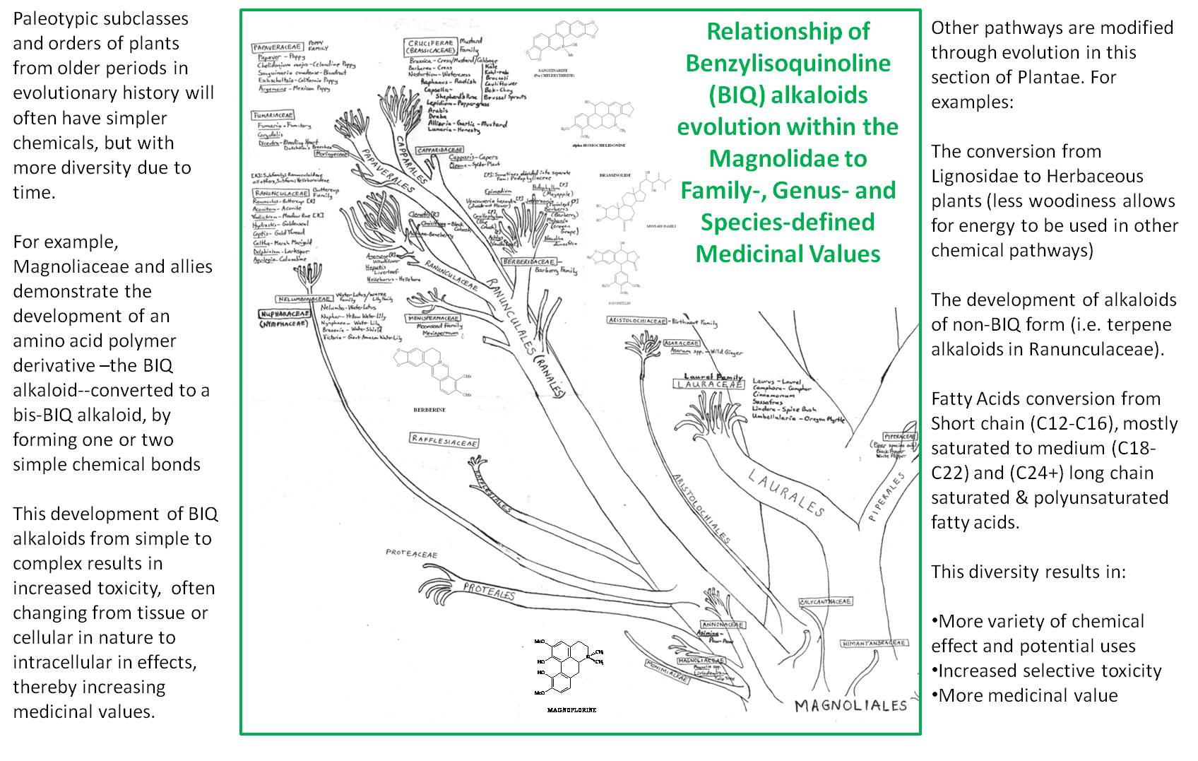 Some groups have very limited distribution in terms of ethnobotanical importance. There are several groups that as research continues, are expect to appear more applicable to inclusion in this review. The benzylisoquinoline alkaloids for example have numbers human and natural ecological and environmental features attached to the reasons for their presence. The classic uses are most important for this review. Scientific progress will no doubt find many more subcategories for specific plant product uses. Identifying these fairly infrequent if not rare, and sometimes misappropriated or misclaimed uses, as a part of these tables would be produce more a table of exceptions and unqie findings rather than a table that demonstrates the most basic features shared between plant groups. Like I said on another of my web pages, Occam’s Razors can be detrimental to searches developed for the identification of shared features and similarities. These tables are meant to provide insights more at an ethnobotanical level, at the pre-industrial level, not the Occam’s razor level so common to plant products research.