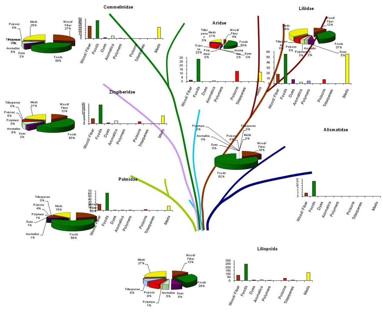 It should not be a surprise that the most chemically complex subclass is Liliidae and the least chemically complex subclass the Alismatidae. Notice the high medicine productivity of Liliidae, Commelinidae, Zingiberidae, Aridae, and Palmidae, in descending order. Since there are relatively few genera in the paleotypic Aridae, this is a little misleading. But otherwise, if we combined the bar chart evidence with the pie chart evidence we get a much better idea on the distribution of the major plants uses at a subclass level. When each subclass is reviewed, the details of this distribution of chemical-ethnobotany features can be better understood, and even predictable at times.